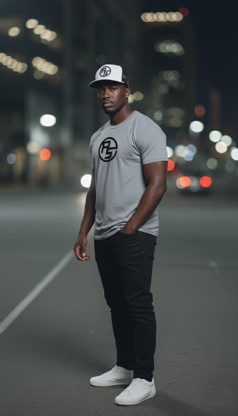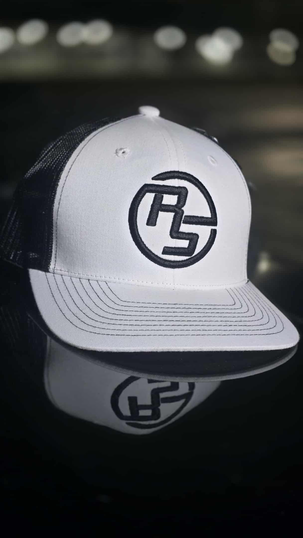 A white and black trucker snapback mid-profile hat featuring a mesh back and structured front panel.